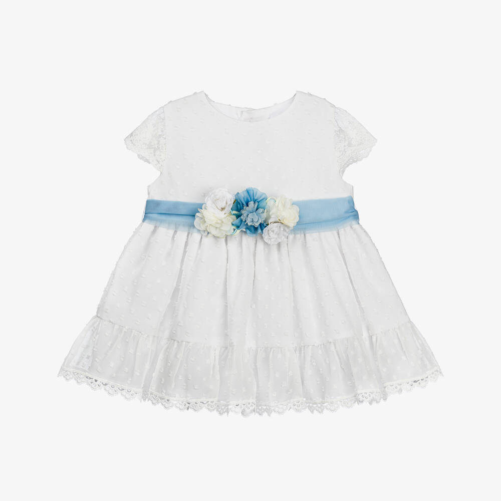 A lovely white dress for baby girls by Miranda, made in lightly textured plumeti fabric. This pretty piece has short lace sleeves and delicate detailing around the hem. A blue tulle sash, decorated with floral appliqués, ties around the waist for a lovely finish. The dress is comfortably lined and fastens with neat buttons on the back.