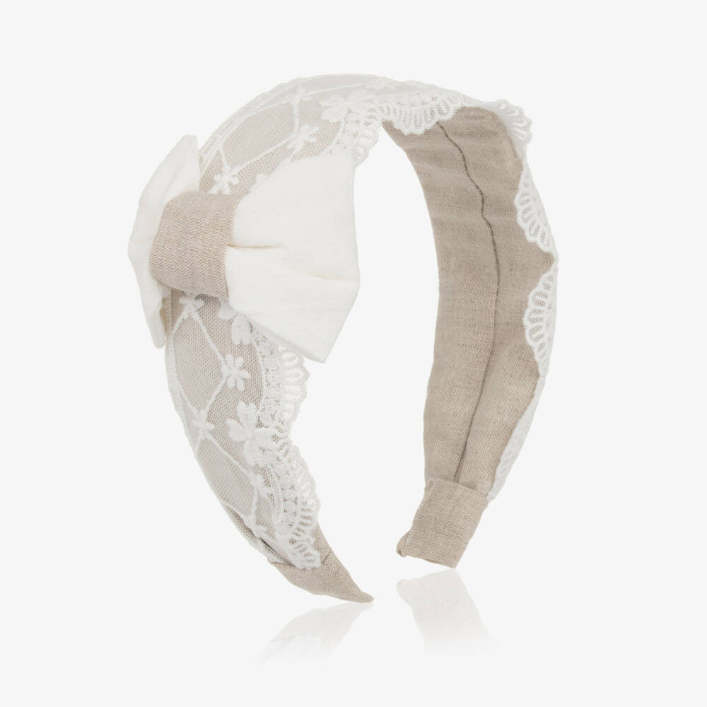 Beautiful beige linen and ivory lace hairband for girls by Miranda. The wide, flexible band is trimmed with a fabric bow on one side for a lovely finish.