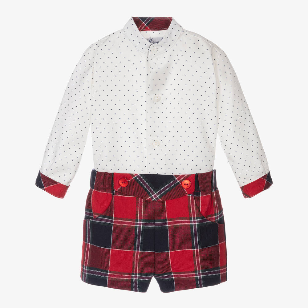 Smart and traditionally styled, this shirt and shorts set for little boys is by Miranda, and is made in soft, lightweight twill. Collarless, the ivory shirt has a little blue polka dot pattern, with red and navy blue tartan trims on the inside of the collar and cuffs. It fastens with buttons on the front and cuffs. The coordinating tartan shorts have decorative red buttons on the elasticated waistband and two useful front pockets. They are fully lined for comfort and are easy to wear, simply pulling up.