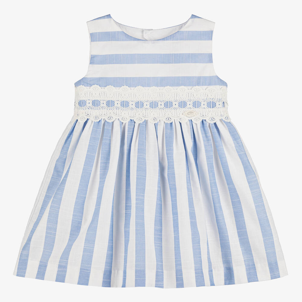 Lovely blue and white striped cotton dress for girls by Miranda, with a beautiful lace band around the waist. Lightweight, with a slub in the weave, it has a cut-out back, with a large, fixed bow over the popper fastening. The comfortable lining has a frilled hemline for extra volume and flounce.