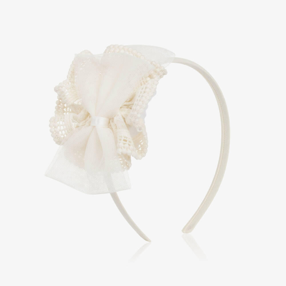 A lovely finishing touch to her special occasion outfit, this ivory hairband for girls is by Miranda. The narrow, flexible band is beautifully trimmed with ivory lace and a tulle bow.