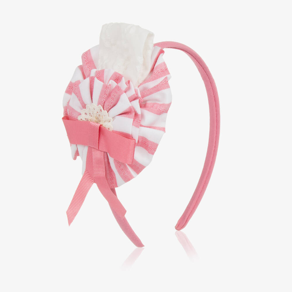 Striped red and white rosette hairband for girls by Miranda. Sitting on a pink flexible band, the layered rosettes are trimmed with lace and finished with a pink grosgrain ribbon bow. The rosette can be removed from the band and worn separately with the accompanying crocodile clip for versatile styling options.