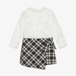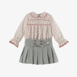 A pretty white and orange skirt set for girls by Miranda, made in a soft and lightweight cotton blend. Fastening with buttons on the back, the white blouse has beautiful flutter sleeves. It comes with a lovely poplin skirt, with a charming floral design and stunning organza bow trims. The lining has a frilled hemline adding volume and the waistband is adjustable for a comfortable fit.