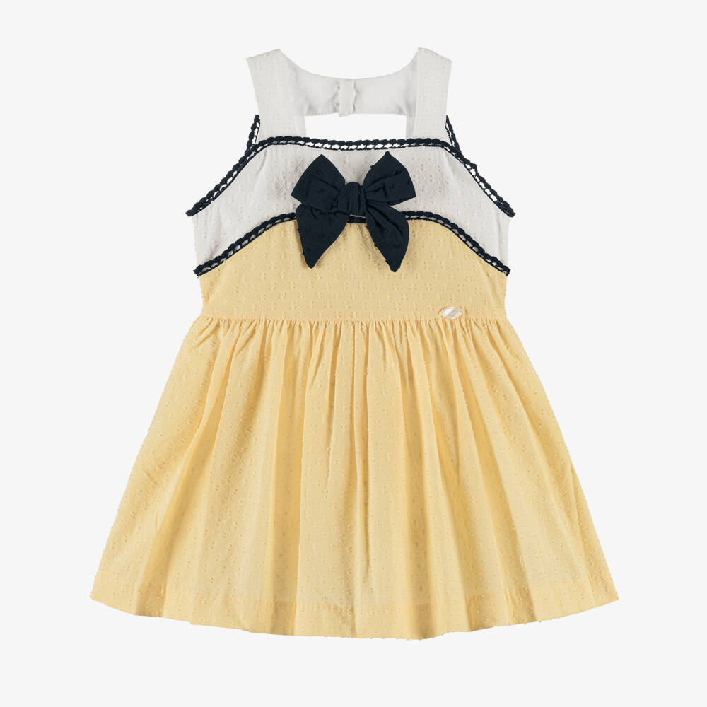 Pretty yellow summer dress for girls by Miranda, made in soft plumeti cotton, ideal for warmer days. The yellow and white bodice has navy blue lace trims and a navy blue bow and logo charm on the front. Fully lined, it has wide shoulder straps and a stylish open back. It fastens neatly on the back with a concealed zip.