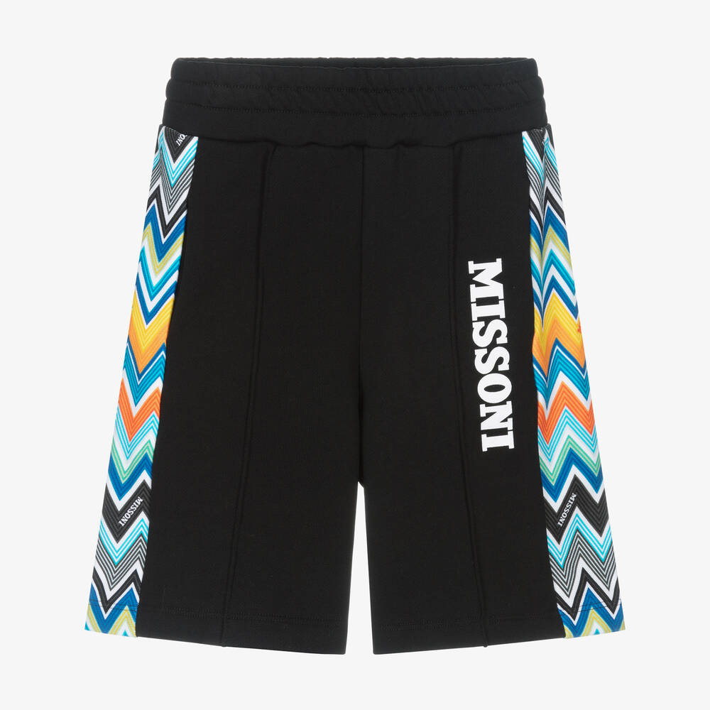 Black cotton Bermuda shorts by luxury brand Missoni, with colourful bands of the designer's signature zigzags and logos on the sides. There are useful, concealed pockets on the front, along with a stylish, sewn centre seam. The main fibre used to make this garment is organic.