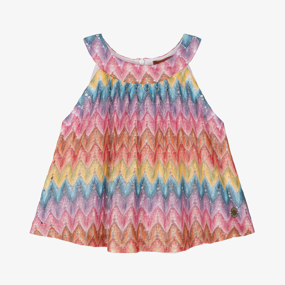 Stylish pink blouse for girls by luxury designer, Missoni. Made in the label's signature zigzag knit, it has a pretty halter neck style and floaty design. Soft cotton lines the style for comfort, and a hidden zip on the back fastens the piece with a seamless illusion.