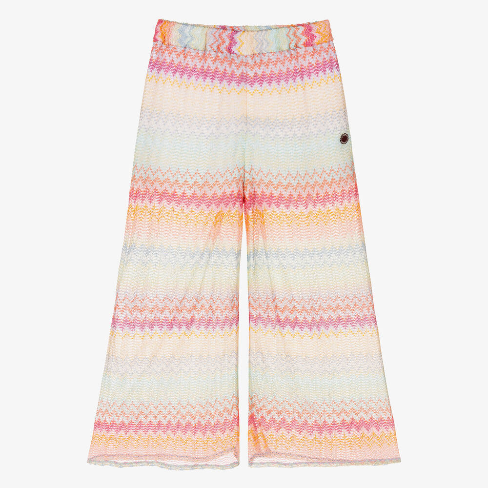 Girls pink trousers by Missoni, the luxury designer. Take their look from poolside to sunset with this wide leg, floaty design. The short lining creates a stylish sheer illusion on the leg, ideal for warmer days. They are made in the signature Missoni knit, with the iconic zigzag code featured in colourful pastels.