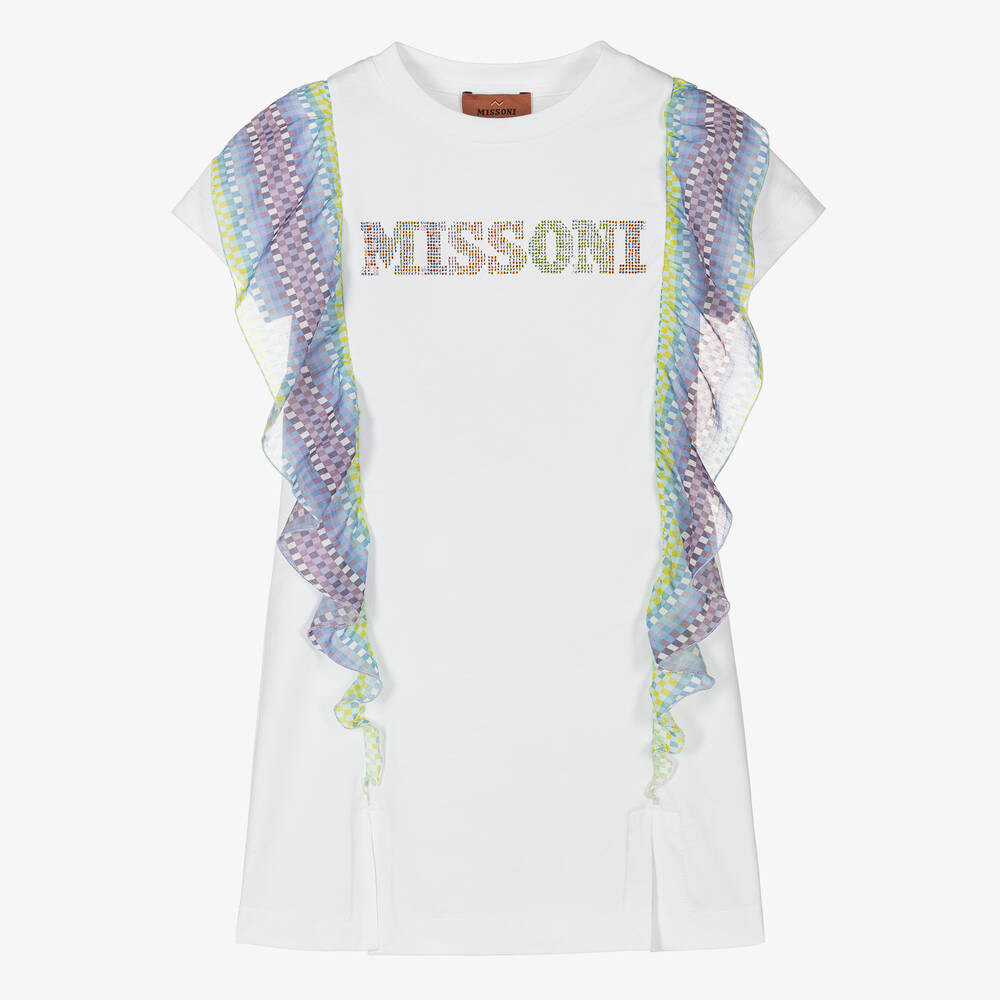 Stylishly comfortable, this white cotton T-shirt dress for girls is from luxury Italian label Missoni. Made in soft jersey, it has a gentle A-line silhouette with small spits on the front hem. Beautiful organza ruffles with a pixelated pattern in rainbow shades and a shimmering, rhinestone logo on the front add a signature designer finish.