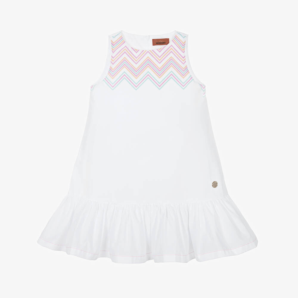 Chic white dress for girls by luxury designer, Missoni. Iconic zigzag detailing can be seen on the shoulders, adding branded appeal. This sleeveless silhouette has a dropped skirt and is lined in soft cotton. A concealed zip on the back fastens the look.