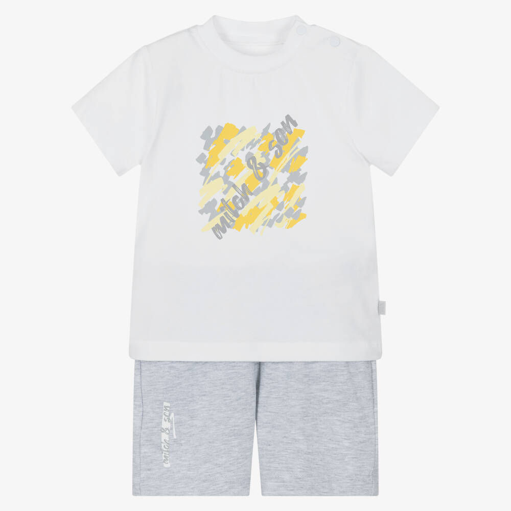 A white and grey marl shorts set for younger boys by Mitch & Son, with a yellow and grey scribble logo print on the T-shirt. Both the pieces are made in soft cotton jersey for casual comfort with a drawstring waist and four pockets on the shorts. Smaller sizes have shoulder popper fastenings on the T-shirt.