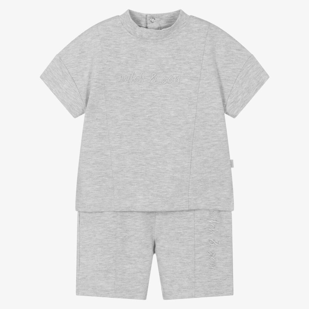 Grey marl T-shirt and shorts set for boys by Mitch & Son made in a cotton blend jersey for comfort. Both pieces have branded embroidery and the shorts have drawstring ties for a better fit. Smaller sizes of the tee have popper fastenings for easy dressing.