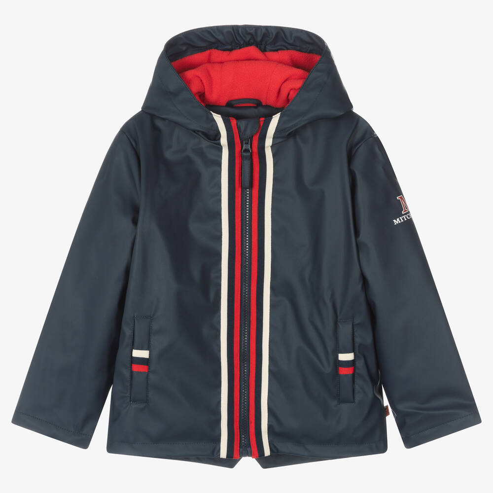 Navy blue raincoat for boys, by Scottish brand Mitch & Son. Trimmed with a sporty red, blue and ivory stripe, it has a front zip fastening with a protective storm flap and fleece-lined hand pockets. Water repellent and warm, it has a cosy polar fleece lining for cold, rainy days and a useful hood. The brand's varsity-inspired logo is printed on one sleeve and there is a matching rubber logo tab on the side seam.