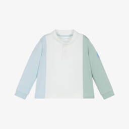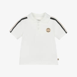 White polo shirt for boys by Mitch & Son, made in silky soft jersey. The contrast navy blue collar and sleeves are silky and lightweight with a subtle texture to the fabric. This casual top has a rubberised logo patch on the chest and a half zip fastening on the front.