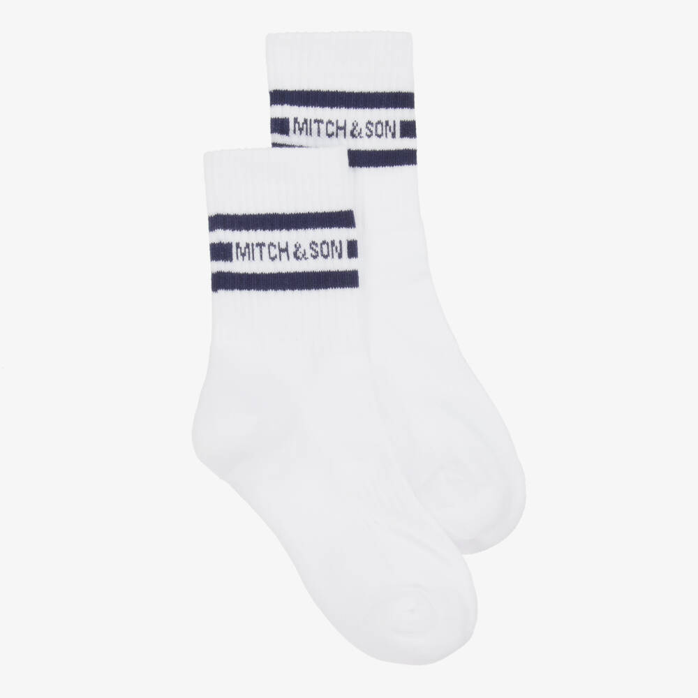 Sporty white socks for boys by Mitch & Son, made in a comfortable cotton blend. These gently ribbed socks have navy blue stripes and logo lettering around the ankle for a branded look.