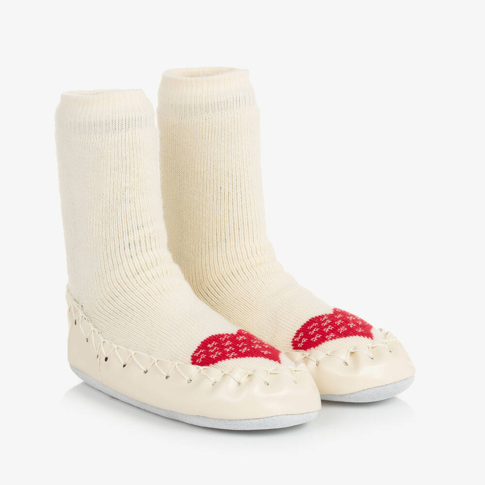 Ivory Moccis for girls made from natural cotton blend Oeko-Tex® certified fabrics, with hand finishes. The leather sole is durable and flexible, allowing children's feet to move freely and muscles to develop. For little crawlers, or older walkers, these indoor shoes have skid proof slipper soles, and double elastic around the ankles.