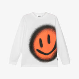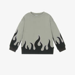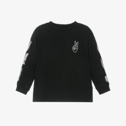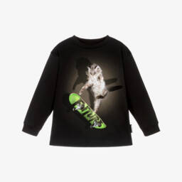 Black long-sleeved top for boys by Molo. It has a flaming 'courage' graphic printed on the front, with matching graphics printed down the sleeves. In a comfortable relaxed fit, it is made in soft organic cotton jersey.