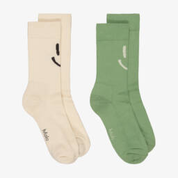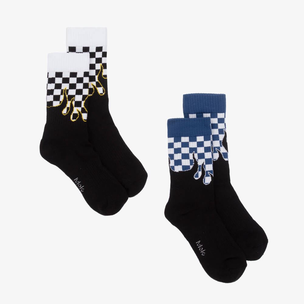 Two pairs of black ankle socks for boys by Molo. Made in a soft cotton rich blend, one pair has a blue and white chequerboard design and the other pair has a matching design in black and white. Both pairs have flame motifs, ribbed cuffs and logo details on the soles for a branded finish.