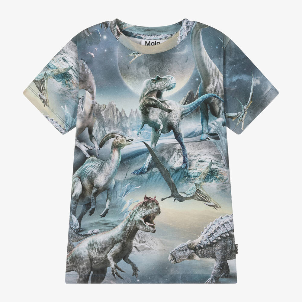 A blue T-shirt for boys by Molo, made in soft organic cotton jersey. With a crew neck and short sleeves, this casual tee is patterned with graphic dinosaurs in space for an eye-catching finish.