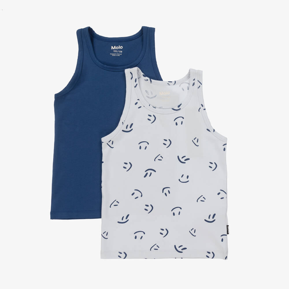 A pack of two blue vest tops for boys by Molo, made in soft and stretchy organic cotton jersey. Comfortable to wear, one vest has a fun smiling face pattern, while the other is in a plain blue colourway.