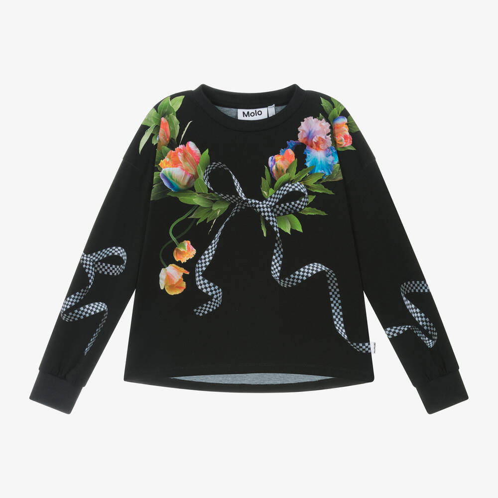 Black organic cotton top for girls by Molo, with an eye-catching, colourful print of iris and tulips, tied by black and white gingham bows. Relaxed and casual, it is made in soft, comfortable jersey, with a drop-shouldered fit and a hemline that is slightly longer around the back.