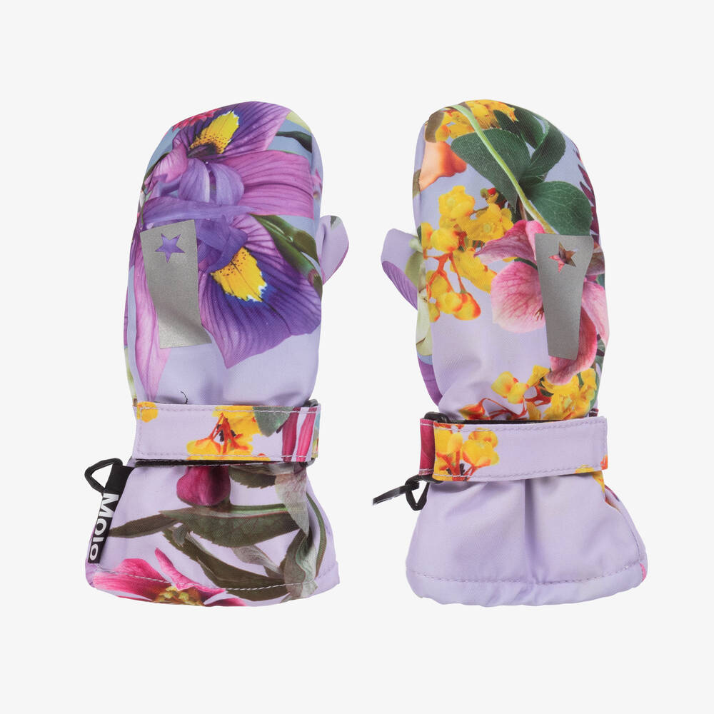 Blue and lilac purple floral print ski mittens for girls by Molo, with reflective trims for improved visibility on the slopes. Warmly padded with technical insulation, these comfortable waterproof, windproof and breathable mittens are lined in cosy polar fleece. They have long, velcro-adjustable cuffs, a clip to attach them together, and slip-resistant palms for good grip.