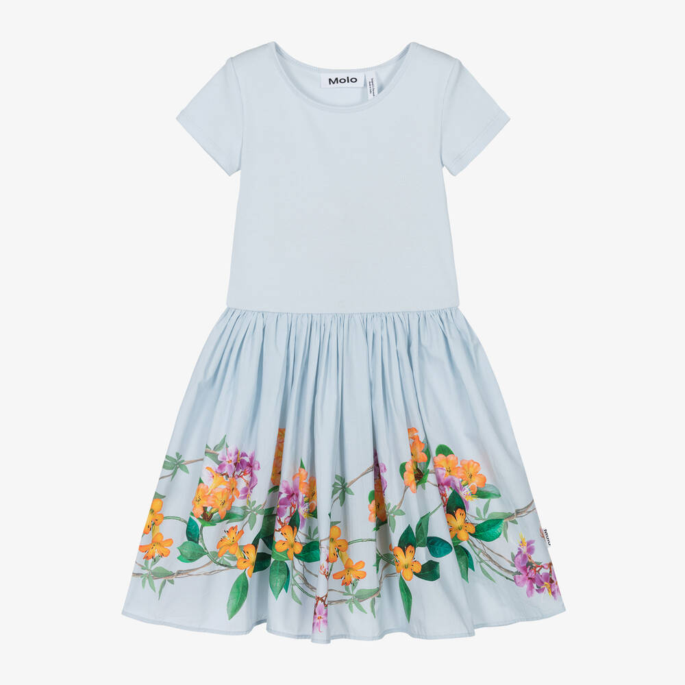 Light blue dress for girls by Molo. The top of the dress is made in softly ribbed organic cotton jersey. The full skirt made in lightweight poplin is patterned with vibrant orange and pink tropical flowers. Easy to wear, this pretty, casual dress simply slips on over the head.