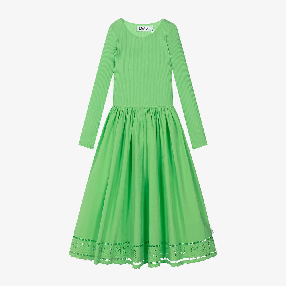 Bright green organic cotton maxi dress for girls by Molo. It has a ribbed jersey bodice with overstitch detailing and a long, gathered poplin skirt with embroidered cut work around the scalloped hemline, spelling out 'You Matter' all the way around. Easy to wear, it just pulls on.