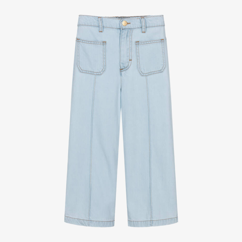 Light blue wide-leg denim jeans for girls by Molo, with a relaxed fit and a washed look. Made in a beautifully soft Tencel and cotton blend, they have 70's-style patch pockets, permanent seams on the front and tan-brown overstitch detailing. They fasten with a gold-tone popper and zip and have a semi-elasticated waistband for comfort.