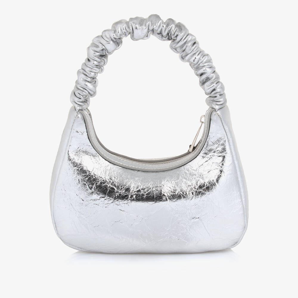 Stylish metallic silver handbag for girls by Molo, with a unique scrunched carry handle. Made in crinkled faux leather, the zip-fastening main compartment is lined in twill and has a pocket for storing small essentials.