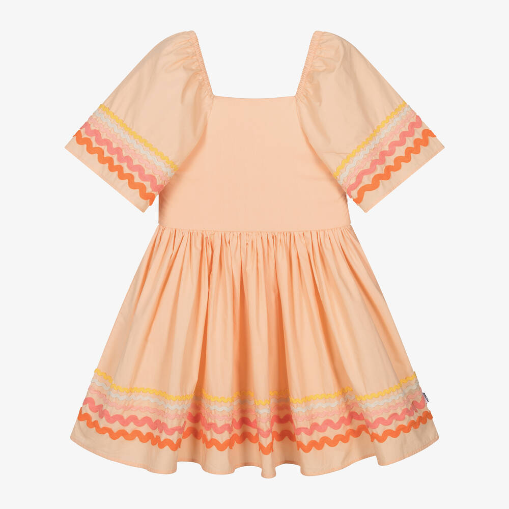 Gorgeous pale orange dress for girls by Molo, with pretty ric rac trims. Made in lightweight organic cotton, it has large, dramatic sleeves with elasticated trims, so can be worn on or off the shoulders. The bodice has a ruched panel on the back for a comfortable fit, whilst the skirt is full and gathered. Easy to wear, it simply pulls on.