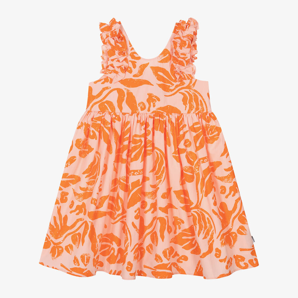 A lovely light pink dress for girls by Molo, made from soft and lightweight organic cotton poplin. This pretty, sleeveless style has ruffles on the shoulders and a V-shaped, wrap-over back. The bodice and the full, gathered skirt feature an orange leaf print for a nature-inspired finish.