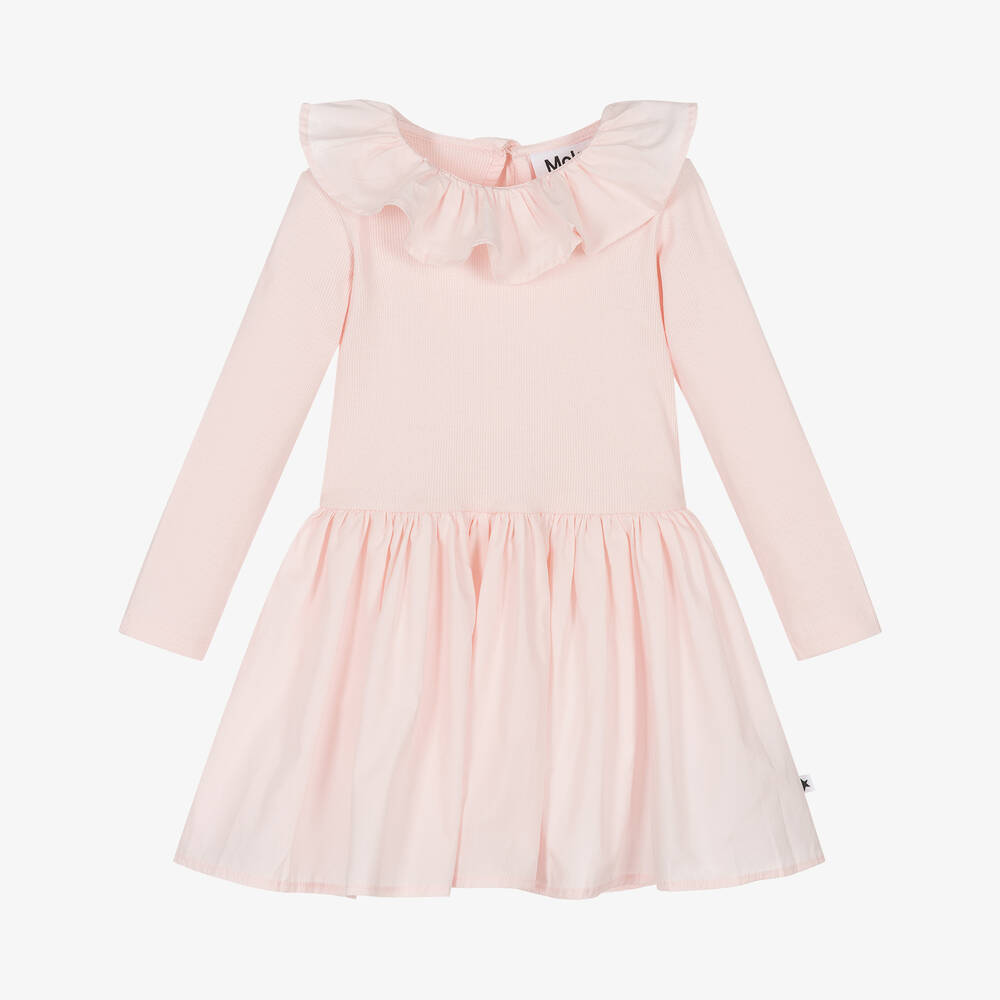 A sweet pale pink organic cotton dress for little girls by Molo. The finely ribbed jersey bodice has long sleeves and a lovely ruffle trim around the neckline, whilst the flared skirt is made in soft poplin. It fastens with a keyhole button on the back.