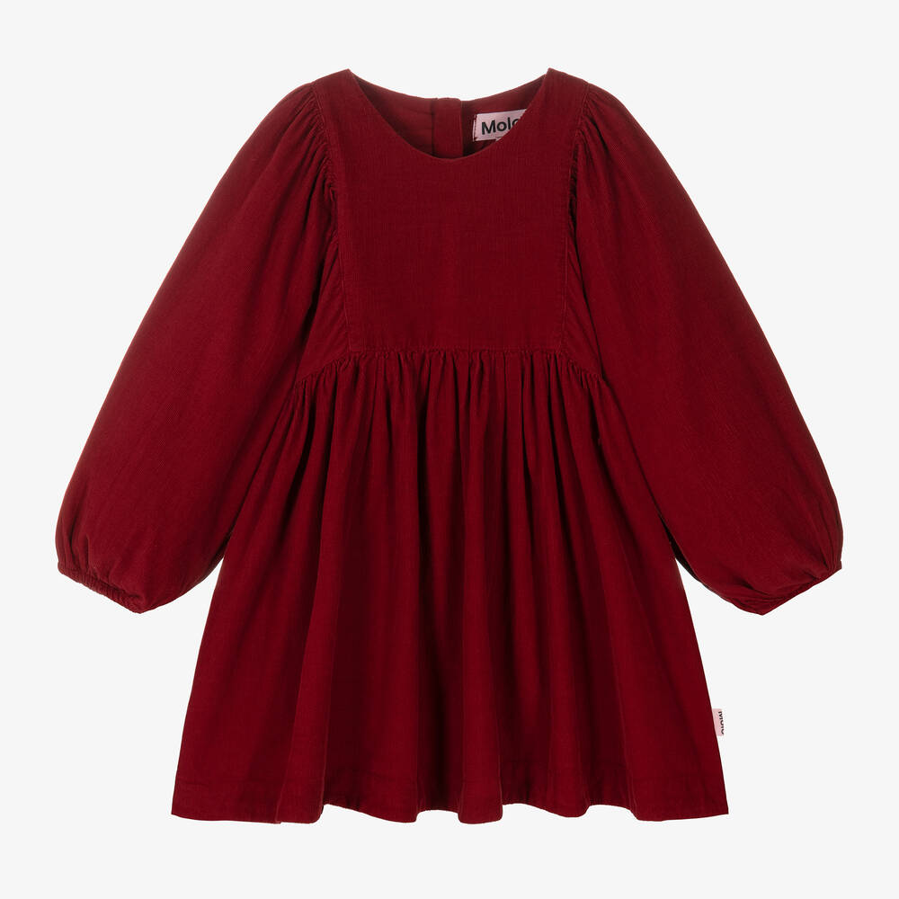 Stylish dark red organic cotton dress for girls by Molo, with oversized puffed long sleeves. Made in fine needlecord for a beautifully soft feel, this lovely dress is designed with a full skirt, a relaxed fit bodice and elasticated cuffs. A concealed zip fastens on the back for a neat finish.