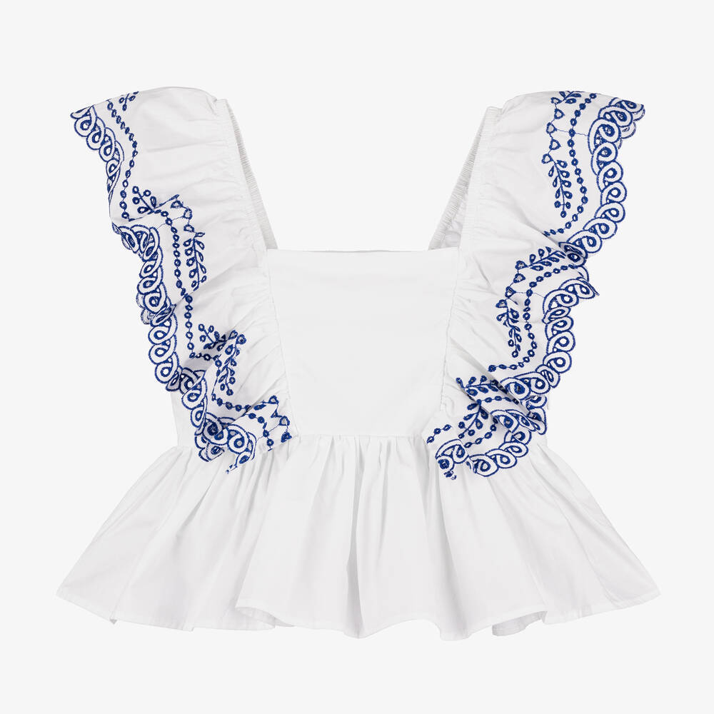 Lovely white cotton blouse for girls by Molo, ideal for sunny days. Made in lightweight poplin, it has beautiful, blue embroidered ruffles over the shoulders and a deep, gathered hemline. Easy to wear, the blouse has a ruched panel on the back of the bodice for a comfortable fit and simply pulls on.