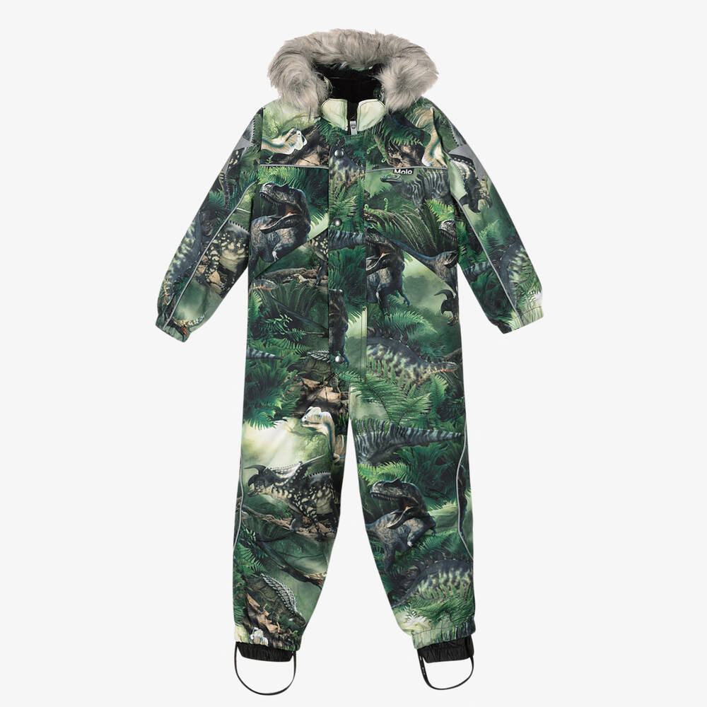 Boys technical snowsuit by Molo, with an all-over green pre-historic dino forest print. Soft, smooth and durable, the shell, lining and padding are made with recycled polyester. With medium-weight 3M™ Thinsulate™ insulation, this breathable snowsuit has an eco-friendly, waterproof coating and taped seams to keep your little one warm and dry. It features handy front pockets, removable rubber stirrups and internal braces. It has a removable hood with a detachable faux fur trim, soft polar fleece lining, and light reflective details for added safety. There is popper flap over the front zip fastening for protection from the elements.