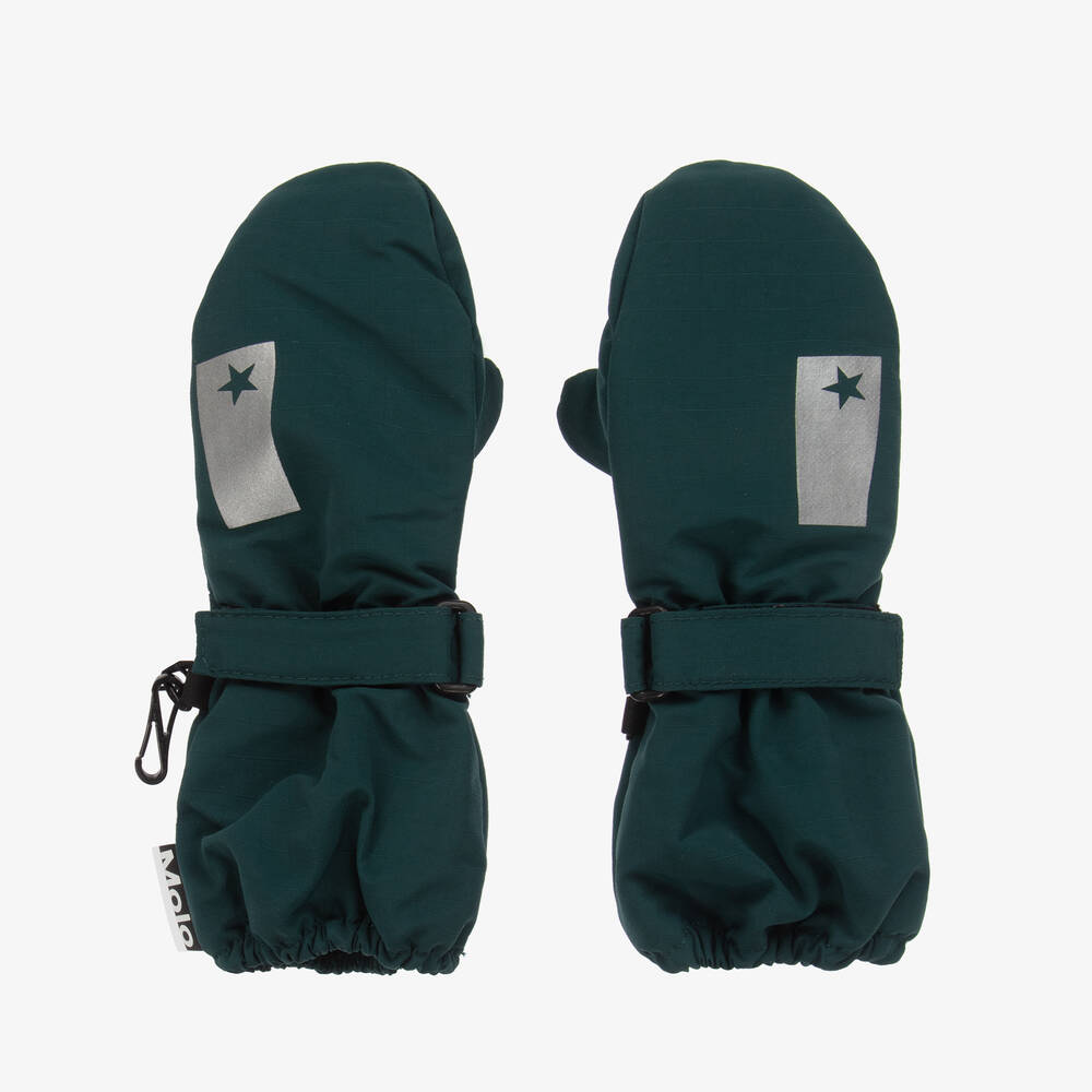 Dark green ski mittens for boys and girls by Molo, with reflective trims for improved visibility. Made using recycled materials, these waterproof, windproof and breathable mittens have lightweight, technical padding and a soft fleece lining for warmth. The long cuffs adjust with velcro, they have slip-resistant palms for good grip, and they can be clipped together to keep them safe when not in use.