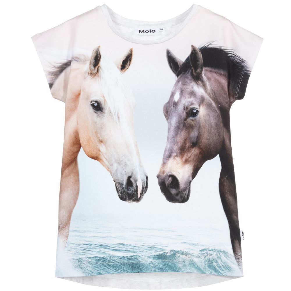 Girls grey marl organic cotton T-shirt by Molo, with a pink and brown digital horse print. Soft and stretchy, this lightweight jersey top has short sleeves and a small branded tab on one side.