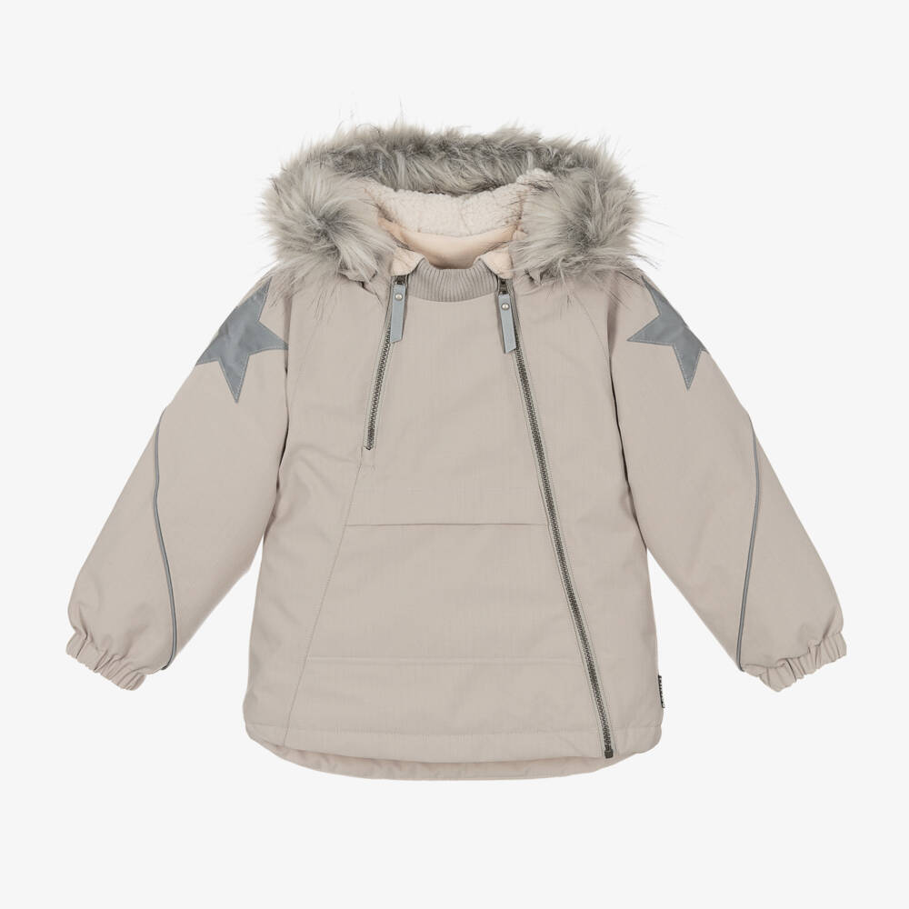 Light grey Winter jacket for boys and girls by Molo, with a subtle grid check pattern. Padded, with a cosy fleece lining, it has taped seams and a useful pocket on the front. The detachable hood has a removable faux fur trim, both secured with poppers. The jacket has a quarter and full zip on the front, with protective chin guards and a ribbed jersey neckline for comfort. The cuffs are gently elasticated and there are reflective stars and trim detailing for visibility. This item contains recycled materials.