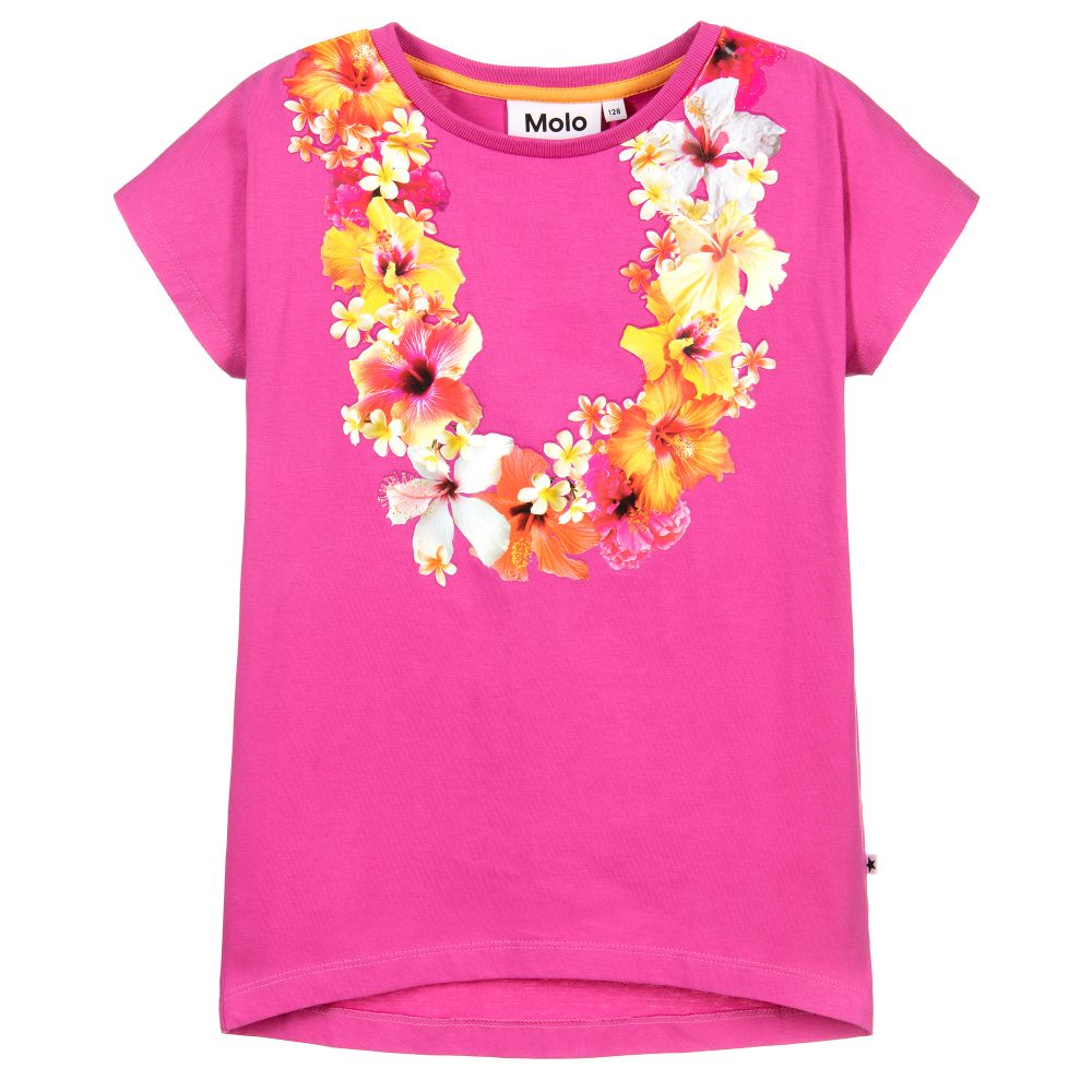 Girls bright fuchsia pink T-shirt by Molo, made in soft organic cotton jersey. The front has a colourful Hawaiian tropical floral print.