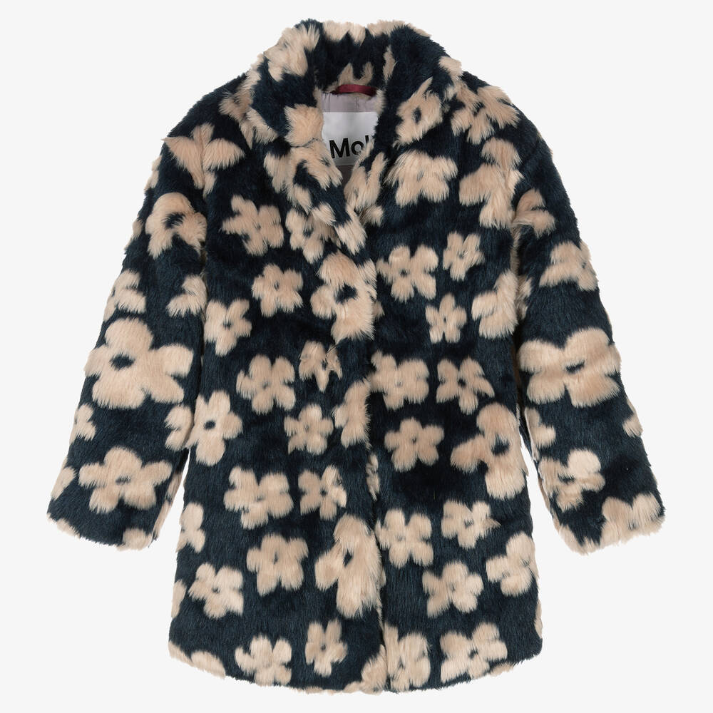 In faux fur, this navy blue coat for teen girls is by Danish brand Molo. Offering a retro vibe, it is patterned in pale pink flowers with a brown logo tab subtly featured on the side. The revere collar and concealed side seam pockets add a relaxed feel, fastening effortlessly with poppers at the front. This coat is finished with a silky smooth lining.