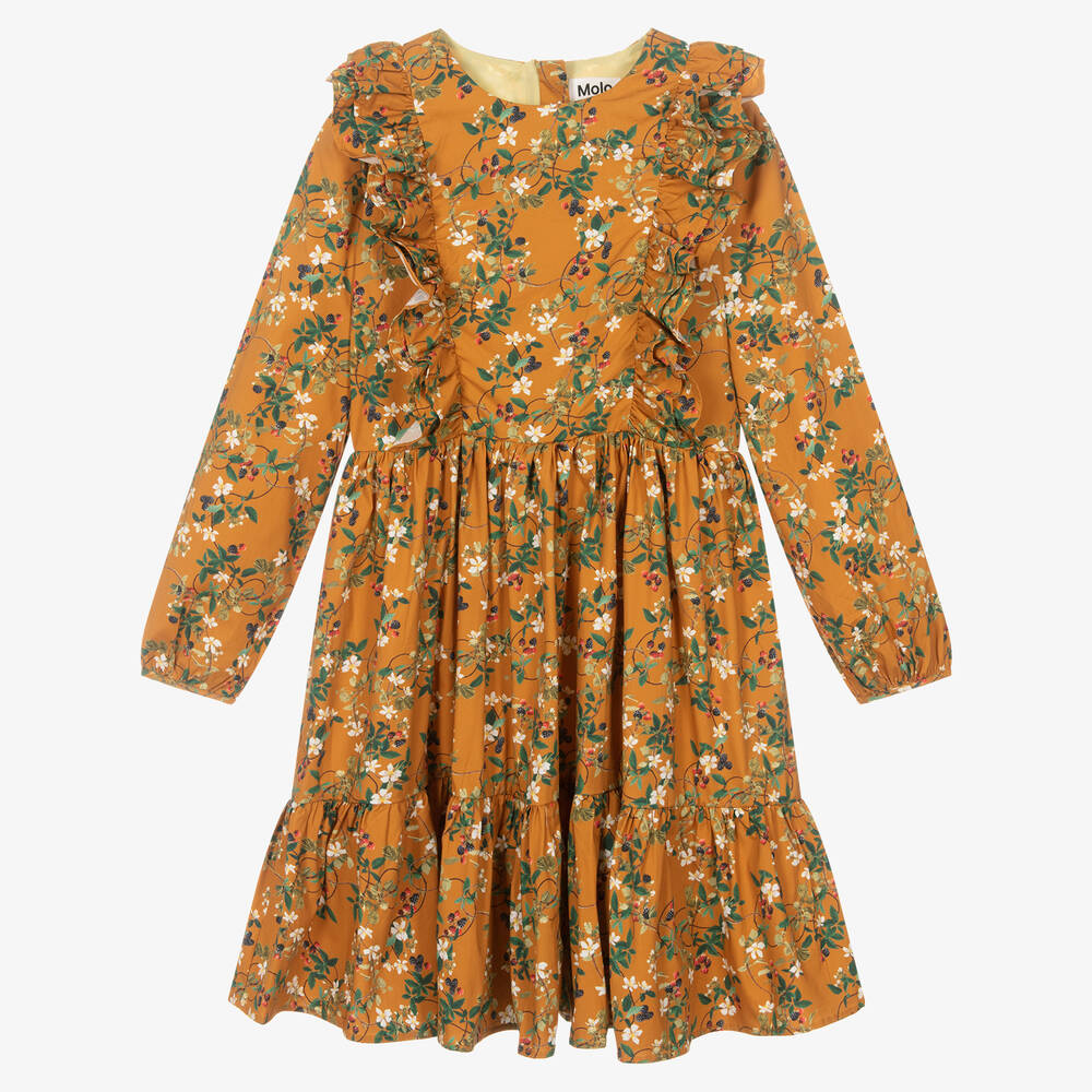 Teen girls deep mustard yellow organic cotton dress by Molo. In the designer's distinctive style, there are botanical berry graphics in shades of green, red and white. Soft, lightweight and slightly stretchy for comfortable wear, this long-sleeved dress has pretty ruffles on the bodice for a feminine touch. It has a pretty tiered skirt and a concealed zip fastening on the back.