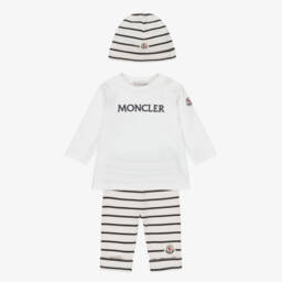 Cute white and navy blue leggings set for little girls by French luxury brand Moncler Enfant, made in soft cotton jersey. The white sweatshirt top has an A-line shape, with a back popper fastening. There is a pink and navy blue 60's inspired logo print on the front and the brand's iconic logo badge on the sleeve. It comes with navy blue leggings.