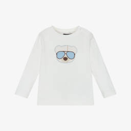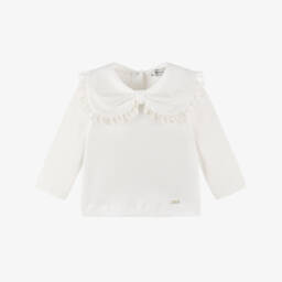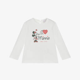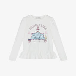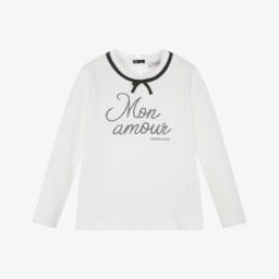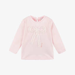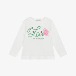 A sweet pale pink long-sleeved top for girls by Monnalisa, made from soft cotton jersey. It is printed with a shiny, iridescent pink ribbon heart design on the chest, surrounded by romantic roses and a logo detail for a branded finish.
