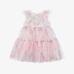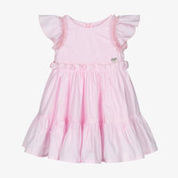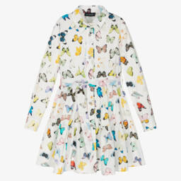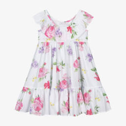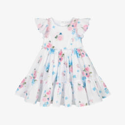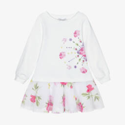 Comfortable for little girls, a white cotton jersey dress by Monnalisa. The front is printed with an adorable kitten sleeping on a bed of beautiful red bows. It has ribbed trims with red stripes and easy-fastening poppers on the back to pull it on over the head.