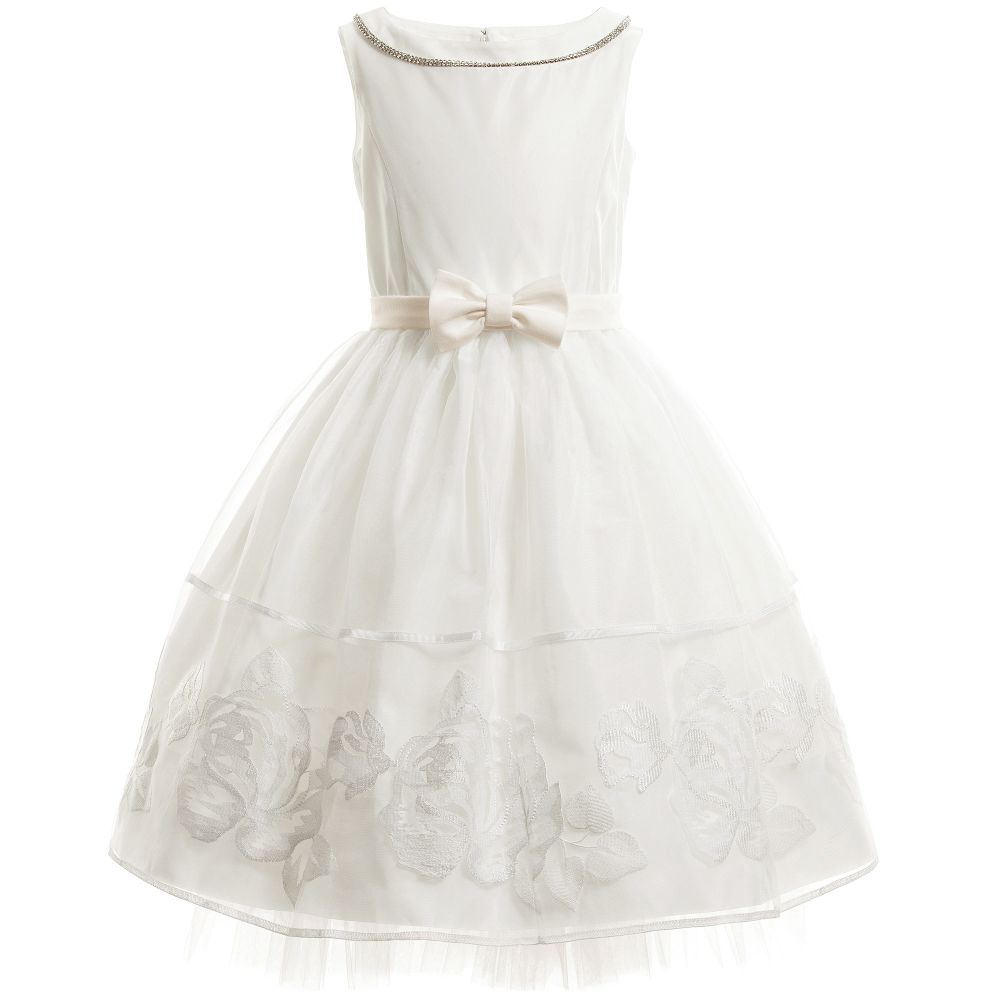 Monnalisa Chic girls stunning ivory couture dress with a smooth silk feel and an embroidered chiffon overlay on the skirt. With a cotton collar decorated with diamante gems, it has classic elegance with layers tulle netting creating a full and feminine shape.