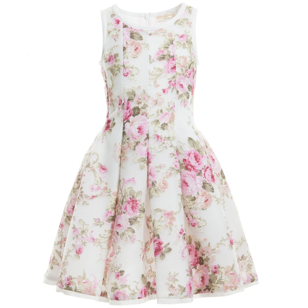 Monnalisa Chic girls lovely vintage rose print sleeveless dress. This classic shaped dress has a round neck and fitted top, with a box pleated skirt that is flared. The style is lined with soft cotton for comfort and fit, but has an outer layer of mesh and top layer of floral organza which is stitched together to give the fabric thickness and weight. There is a concealed zip at the back to ease dressing.