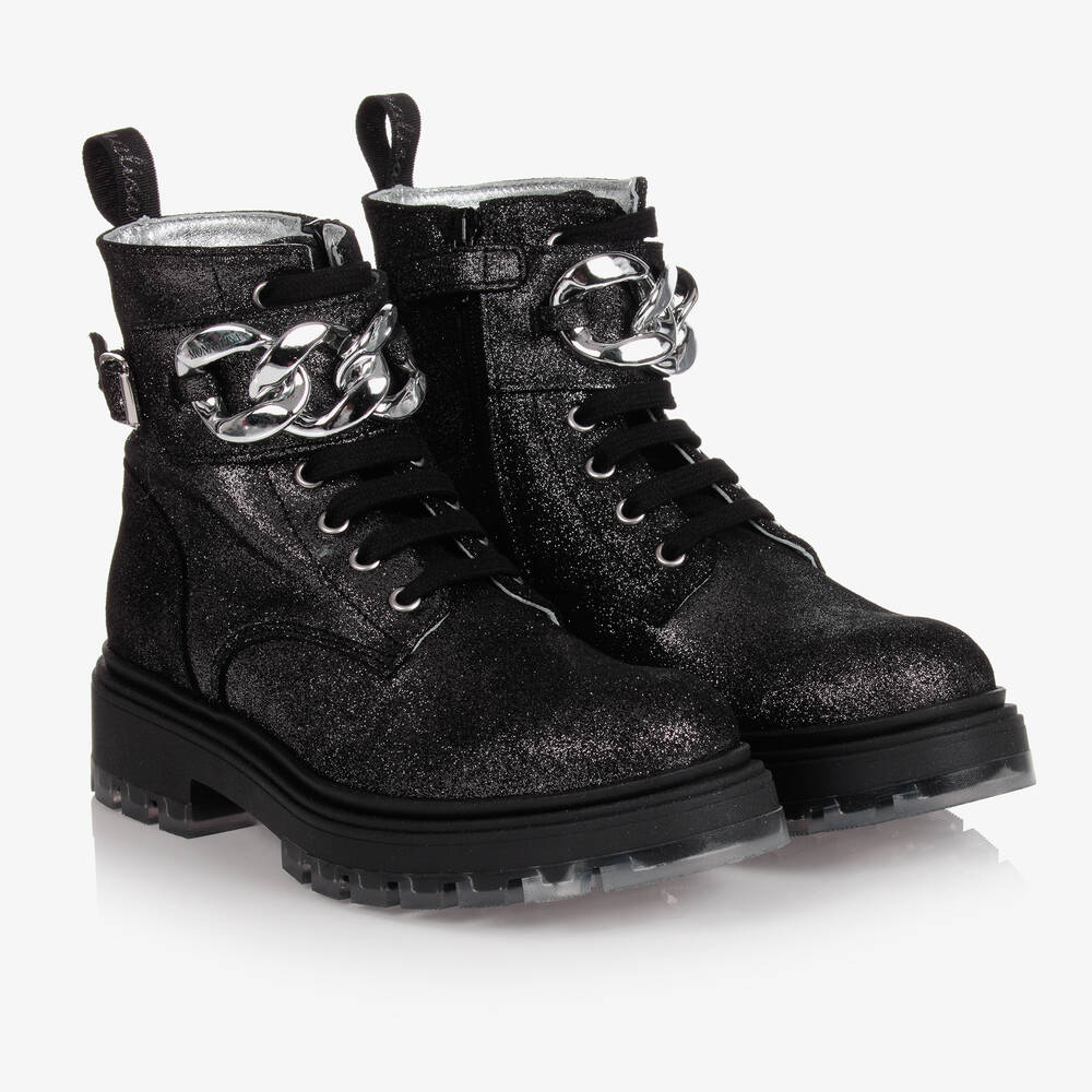 Sparkly black suede leather boots for teen girls by Monnalisa. These chunky boots are detailed with a faux buckle strap across the front, with a statement silver chain. There is a logo tab on the heel and they fasten with a side zip and front laces. The lining is made in soft silver leather for long-lasting comfort, and the thick non-slip rubber sole is detailed with a cool transparent layer.