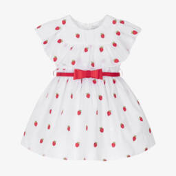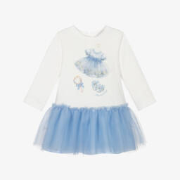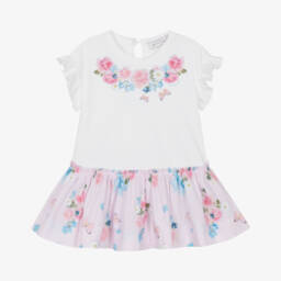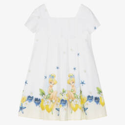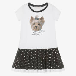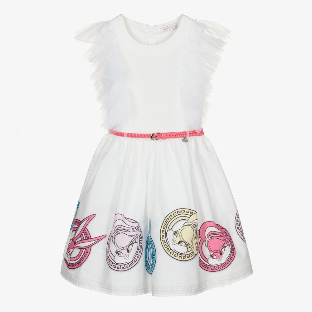 Stylish white dress for teen girls by Italian designer, Monnalisa. The comfortable jersey bodice has large tulle frills over the shoulders. The gathered cotton skirt has a print of Bugs Bunny and his girlfriend Lola in blue, pink and yellow, with Greek key detailing. The shiny pink plaited belt has a silver logo charm and is detachable. The cotton voile lining has a tulle frill for extra volume.