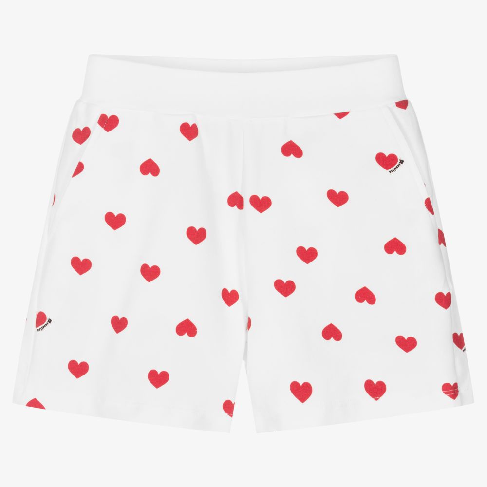 White and red shorts for teen girls by Monnalisa, made in soft and stretchy, mid-weight jersey. They have an all over red heart print, with black logo details in gothic-style script. There is a rubberised logo on the back, a stretchy, comfortable waistband and slanted front pockets.