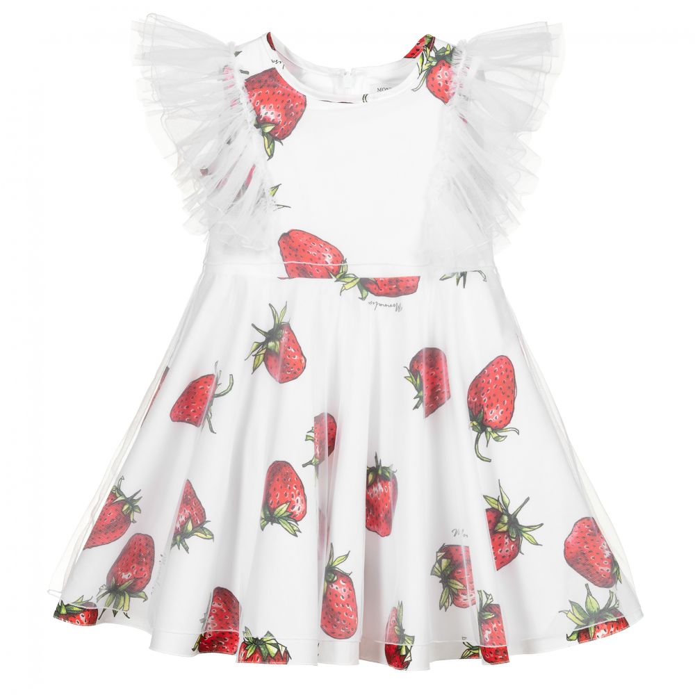 White tulle and cotton dress by Monnalisa. The underlay fabric has a red strawberry print, with lace ruffle sleeves. It is fully lined in cotton and has a tulle petticoat trim to add fullness.